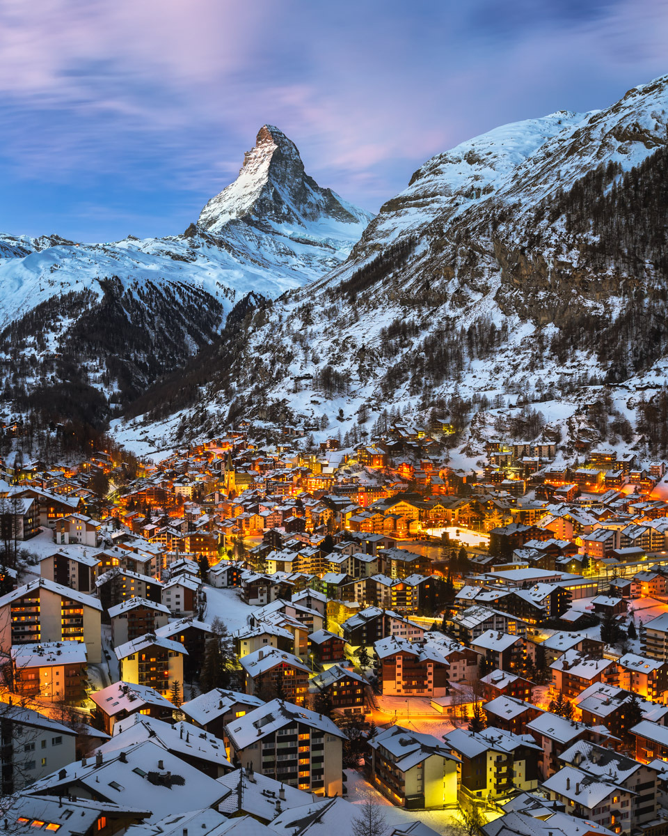석양이 물드는 황혼 무렵, 전통적인 스위스 샬레(chalet) 건물들 사이로 스며드는 따뜻한 조명이 마치 별들이 땅에 내려앉은 것처럼 반짝입니다. 그리고 그 모든 풍경의 배경에는 영원불멸의 상징, 마테호른이 우뚝 서 있습니다.